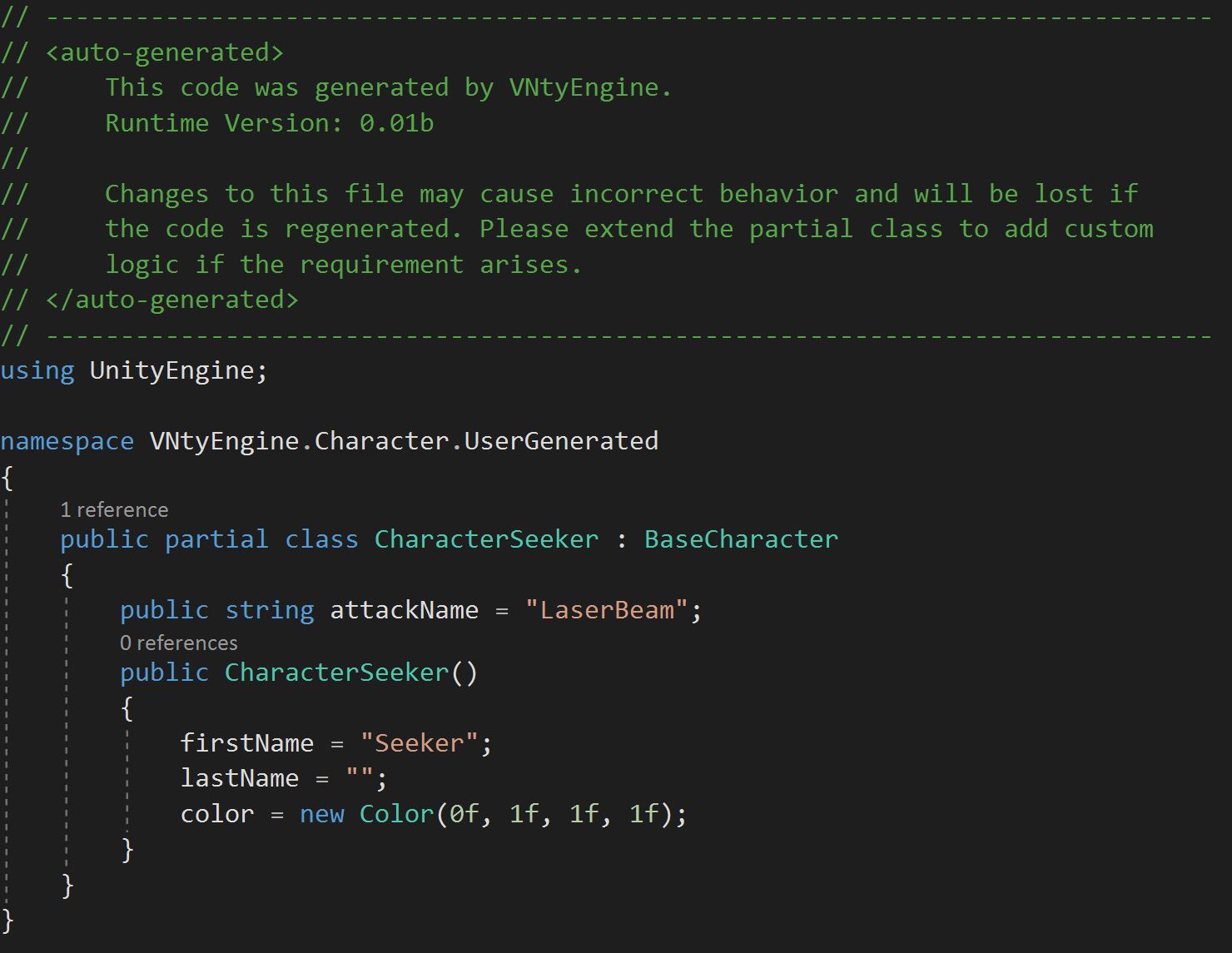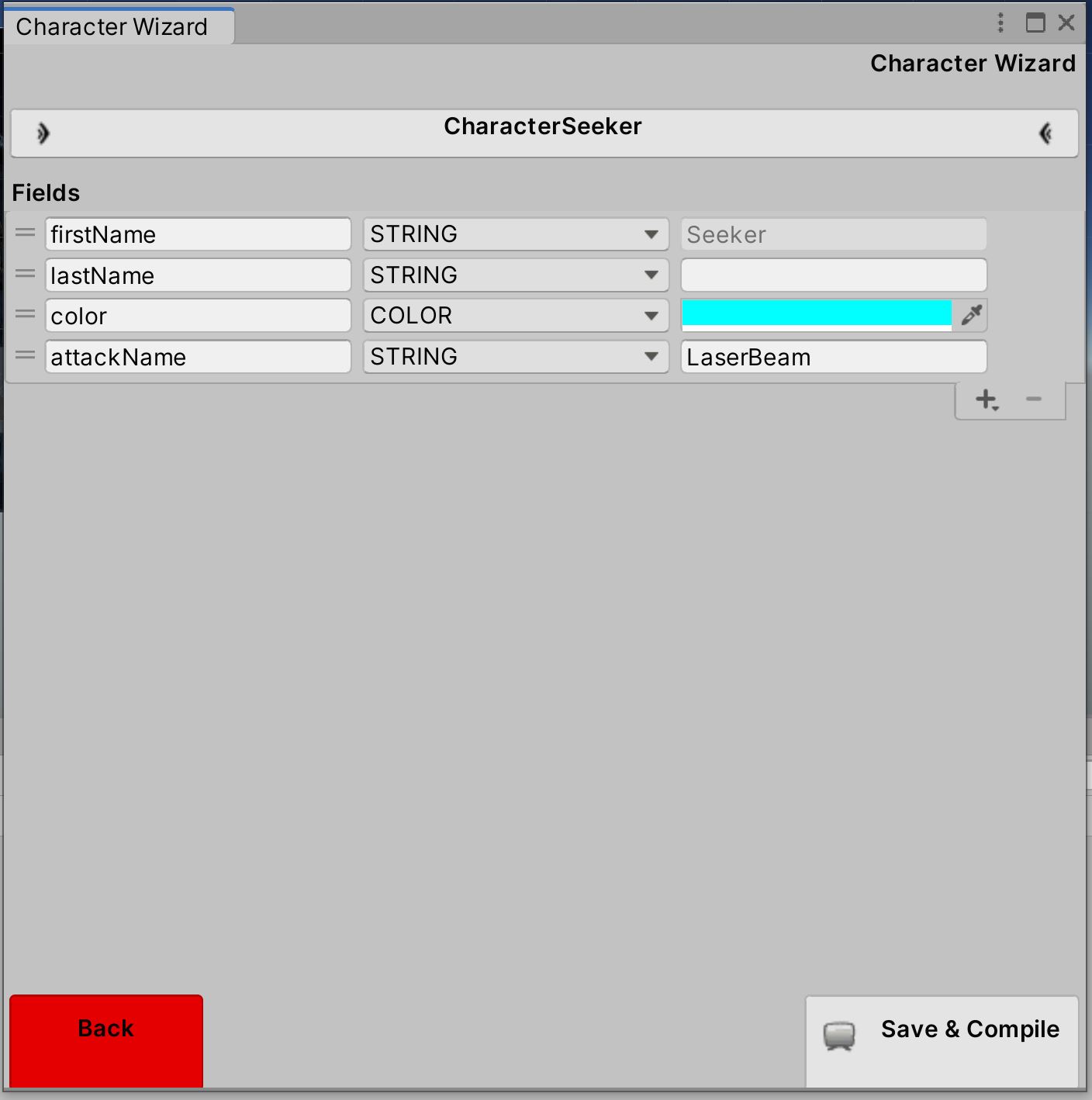 Character Wizard is used to create characters. All you have to do is open up the wizard, type in name of the character, choose a color, add in some stats (fields) if required, and press save. The tool automatically generates the code for you.